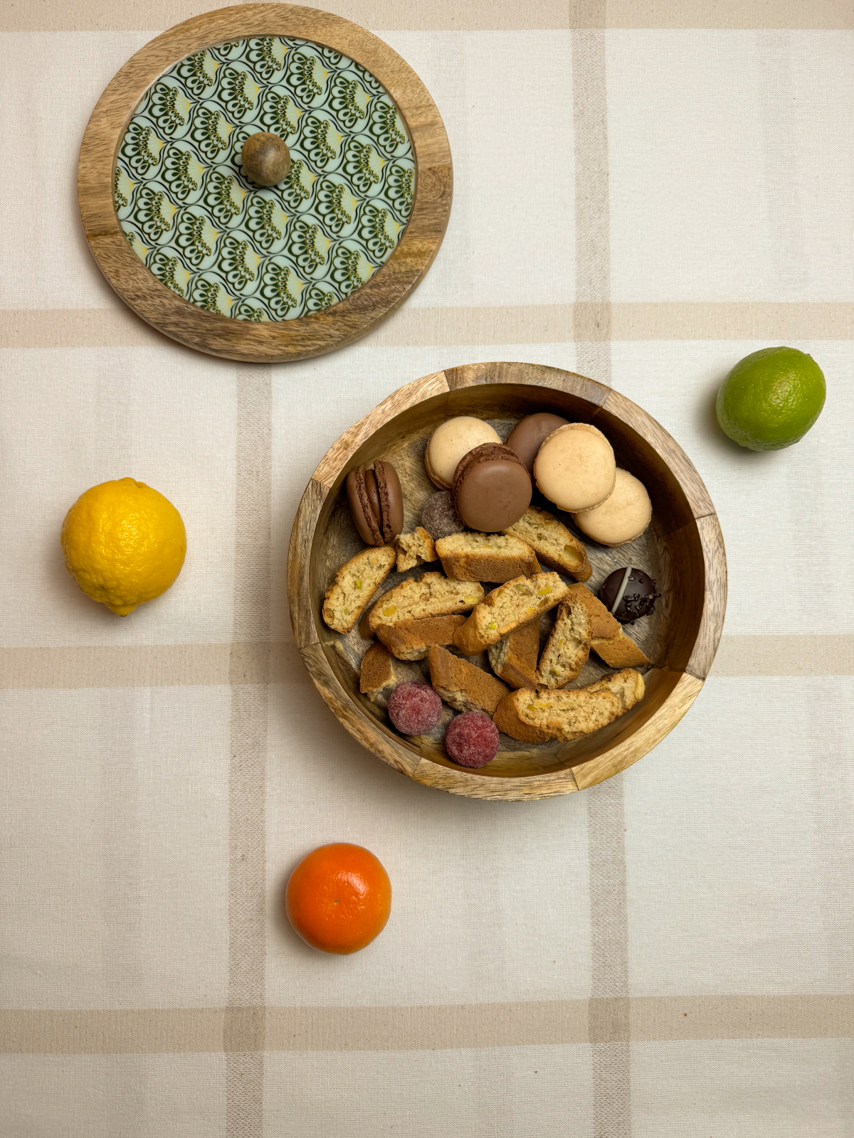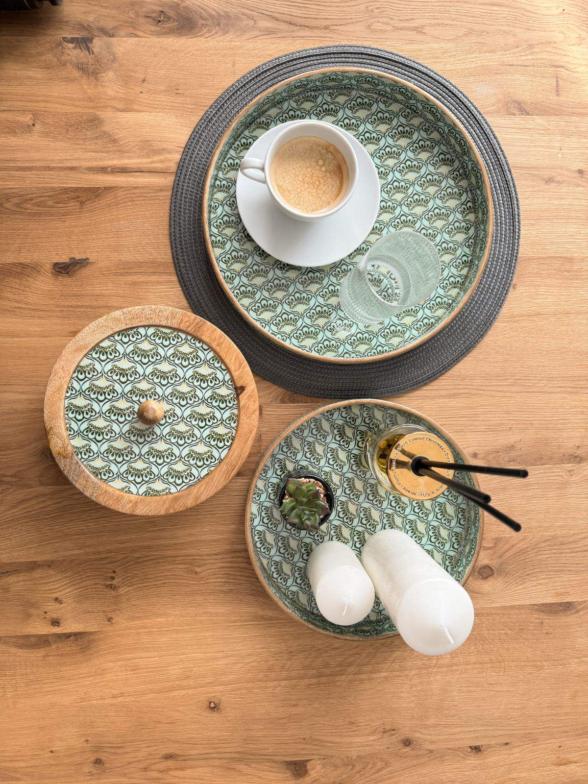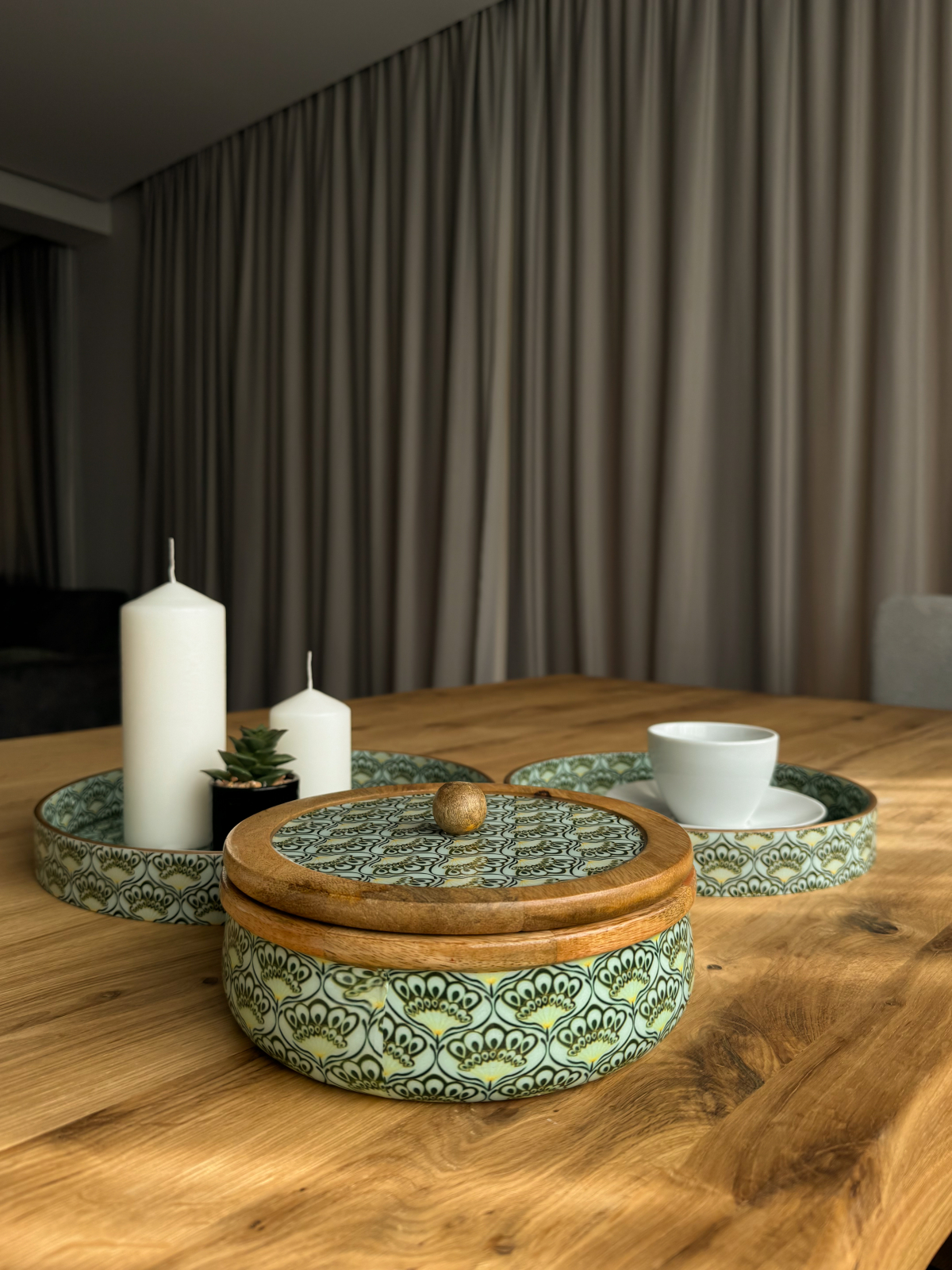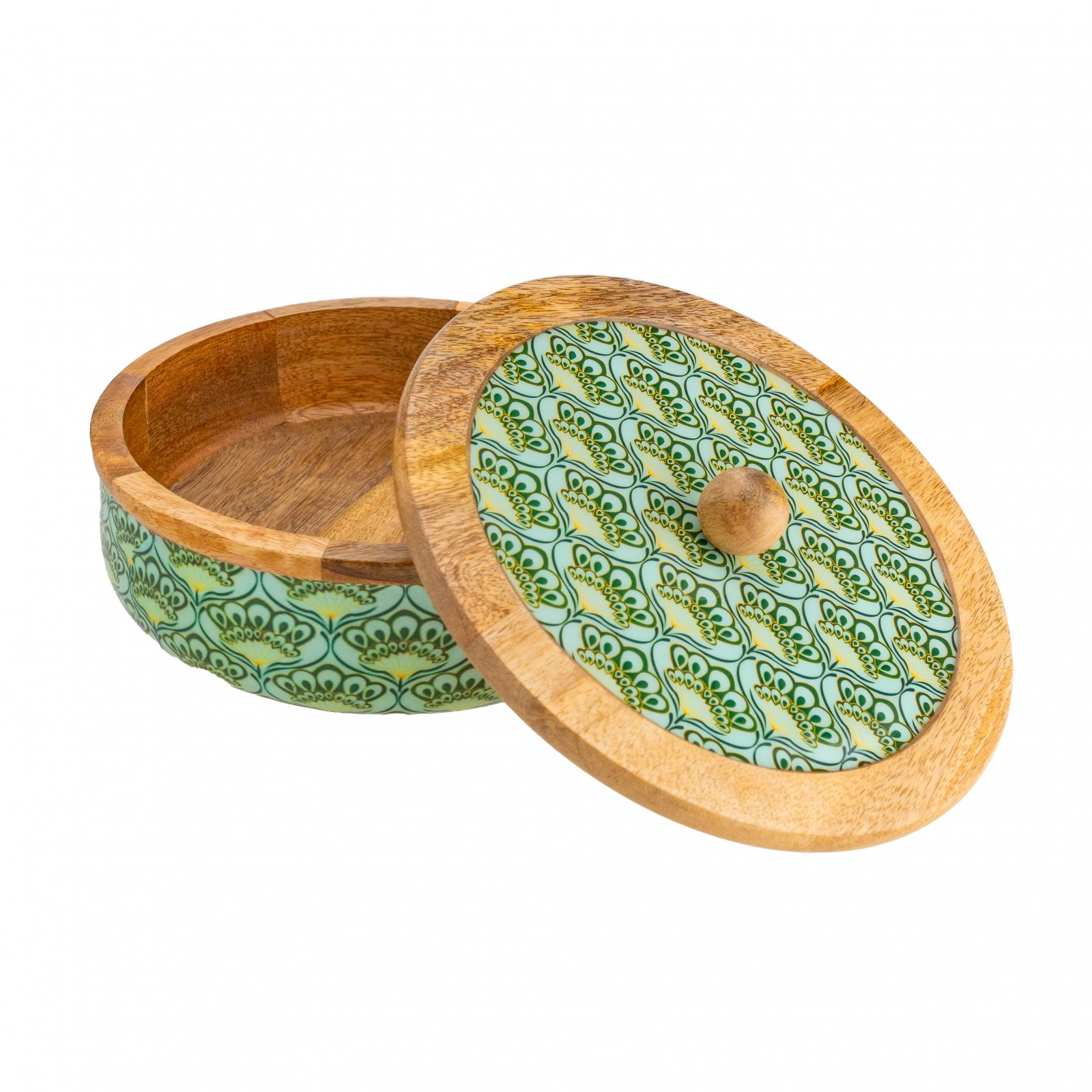 Recipientul din lemn de mango emailat cu model colorat este o piesa practica si estetica pentru stocarea diverselor obiecte sau servirea alimentelor intr-un mod elegant si placut, dar si o piesa decorativa exceptionala.