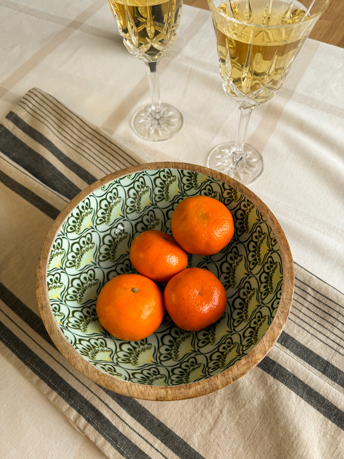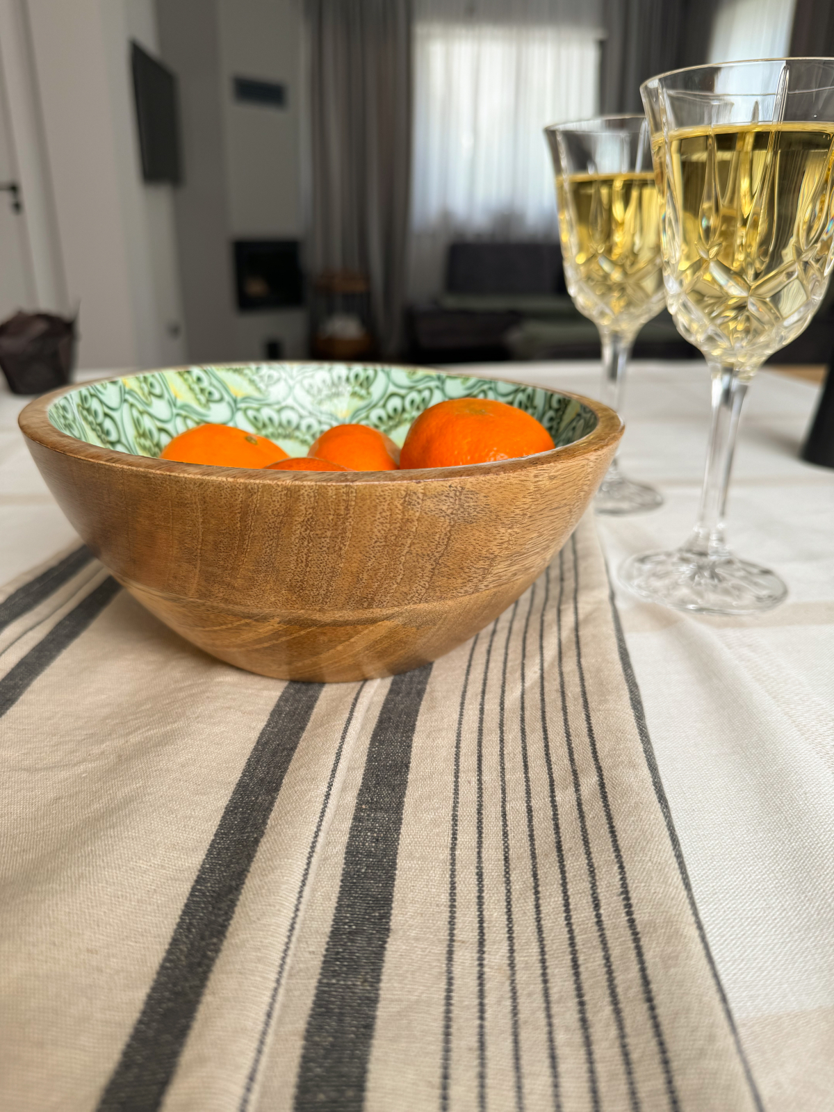Bolul din lemn de mango cu model colorat este o piesa distinctiva si atragatoare, ideala pentru a adauga un plus de farmec si personalitate la orice masa sau decor. Realizat manual din lemn de mango, cunoscut pentru durabilitatea si frumusetea sa naturala, acest bol imbina eleganta rustica a lemnului cu un design colorat si vibrant.