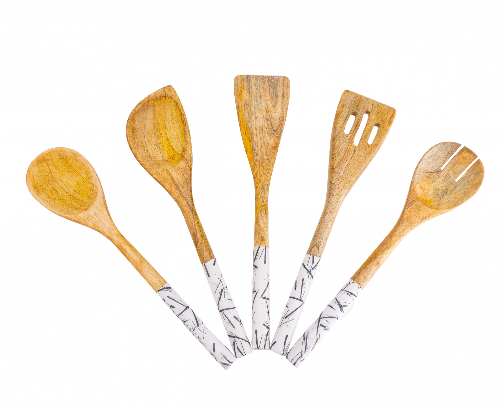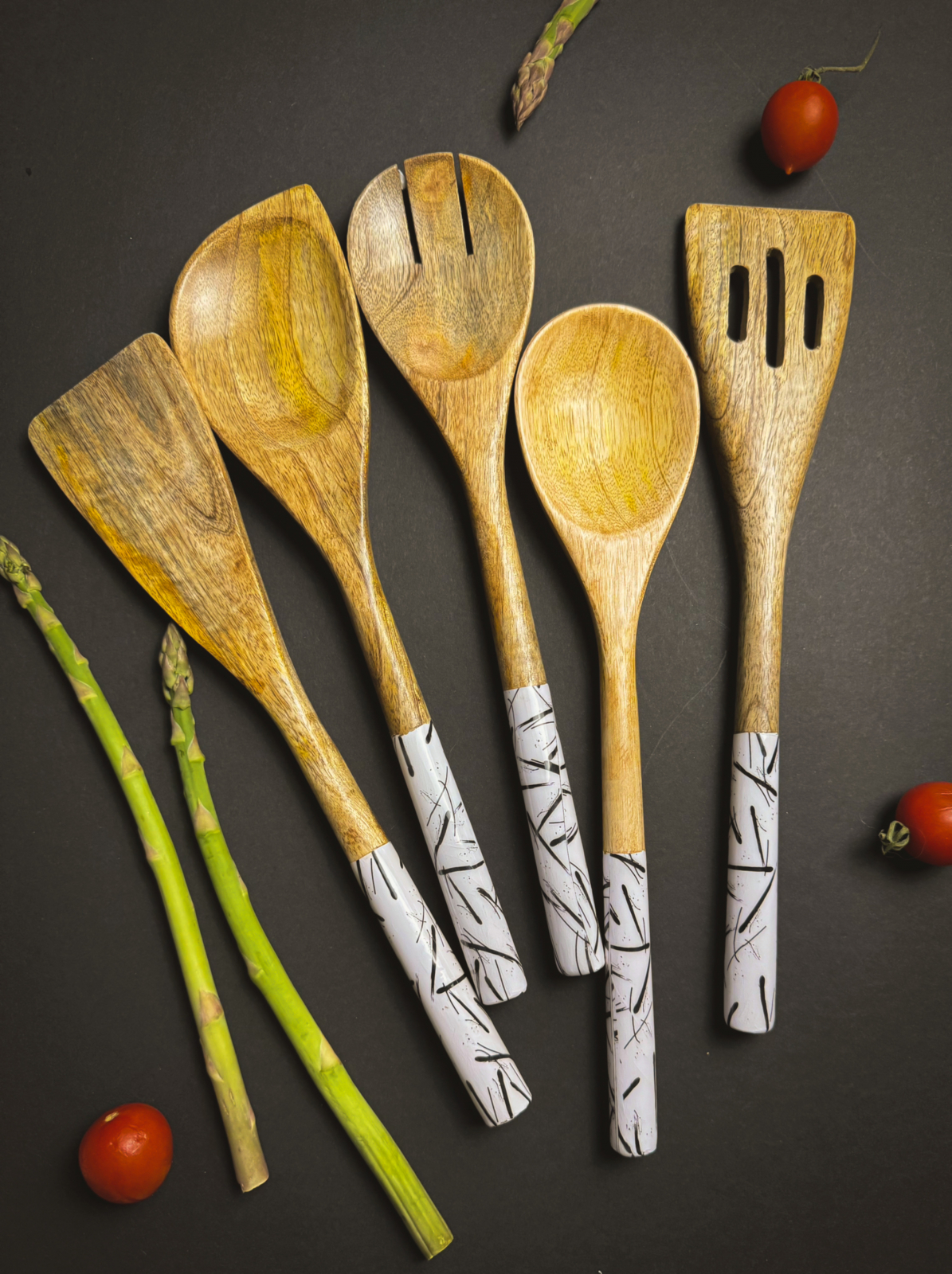 Setul de ustensile  din lemn  de mango este o colectie unica realizata manua.