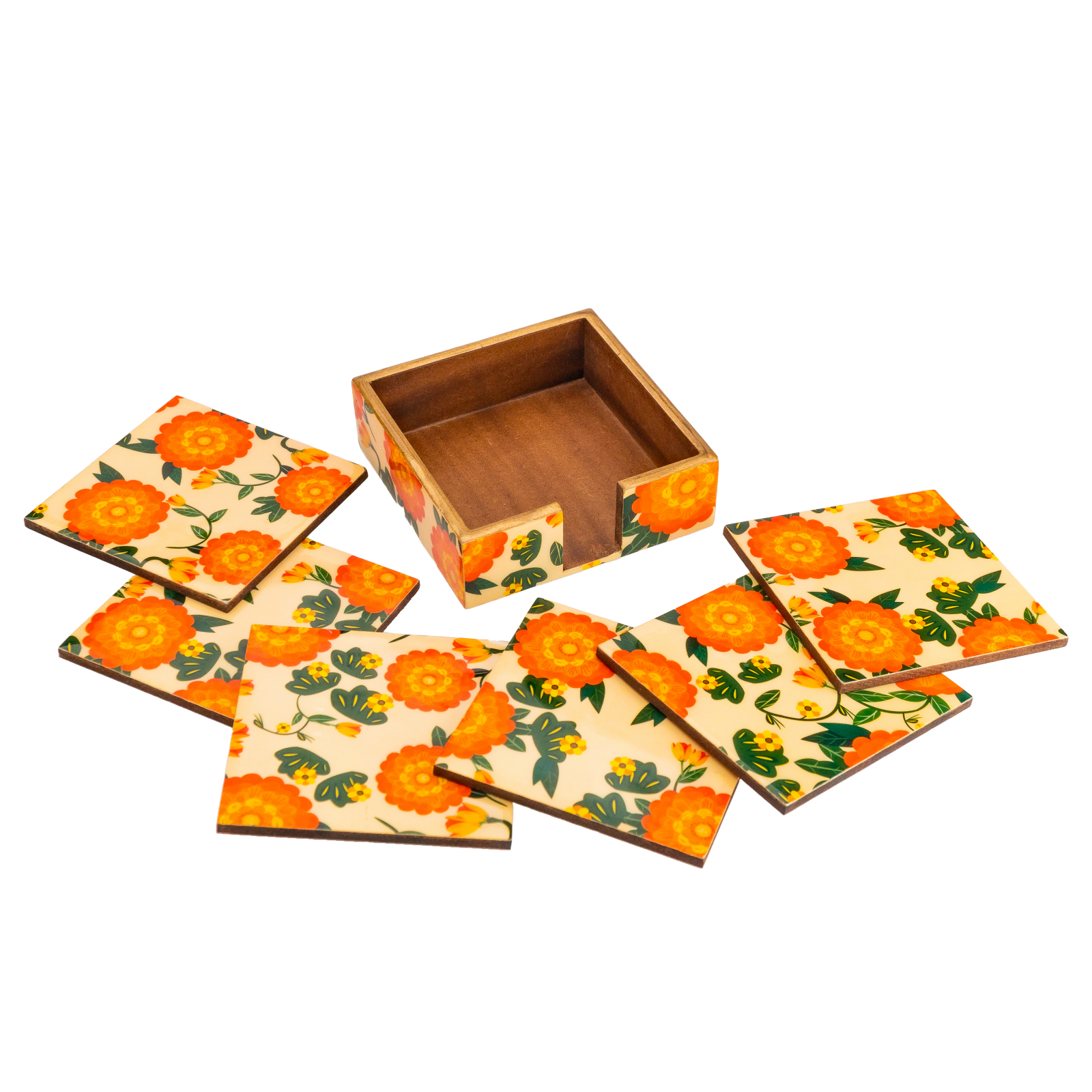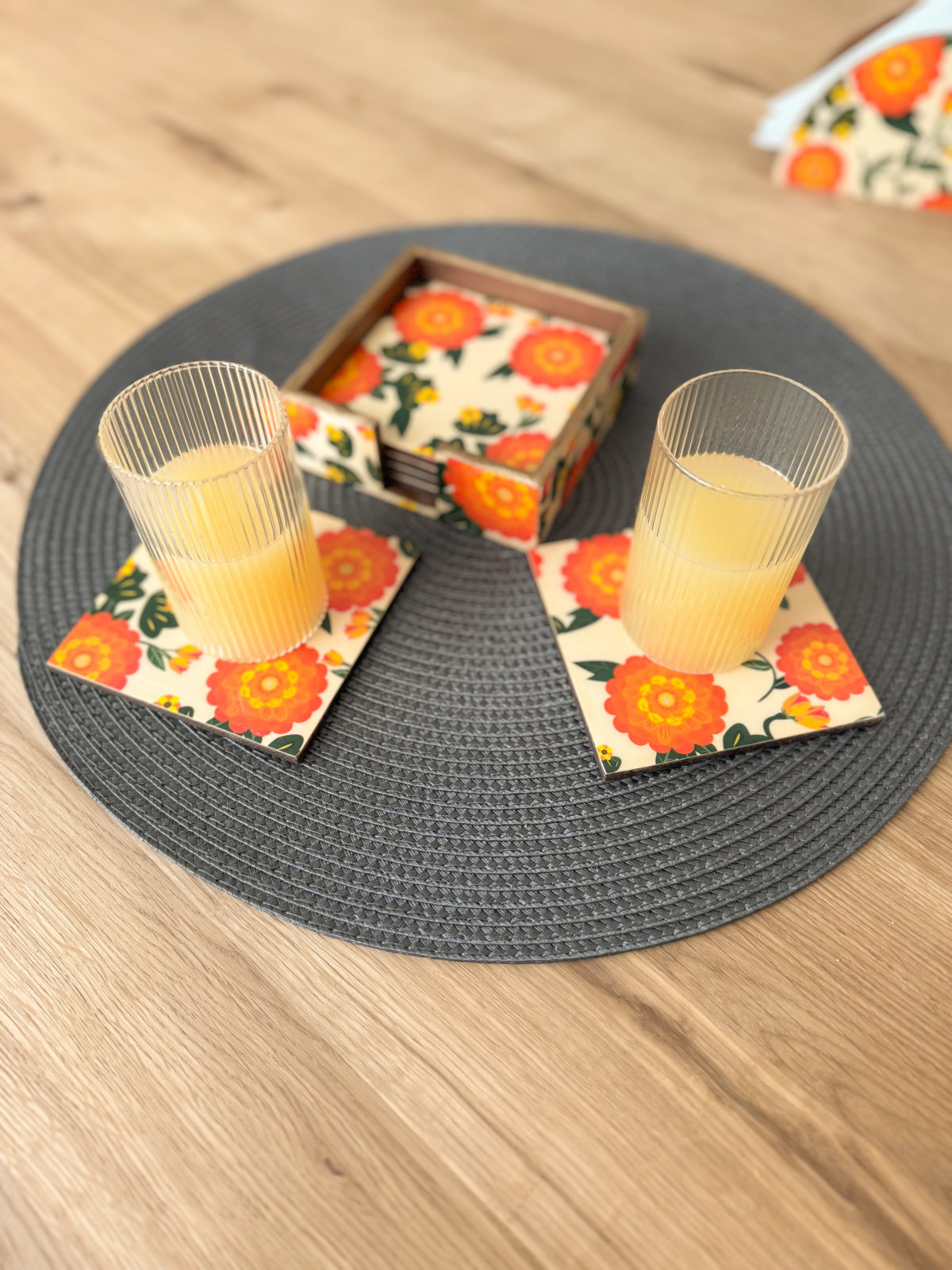 Adauga un strop de eleganta si utilitate colectiei tale cu acest set de 6 suporturi pentru pahare, imbogatit cu un model colorat si un suport deosebit.