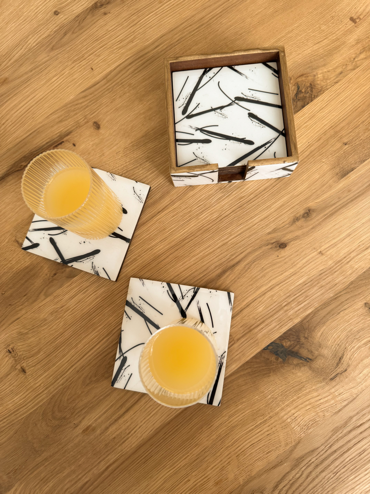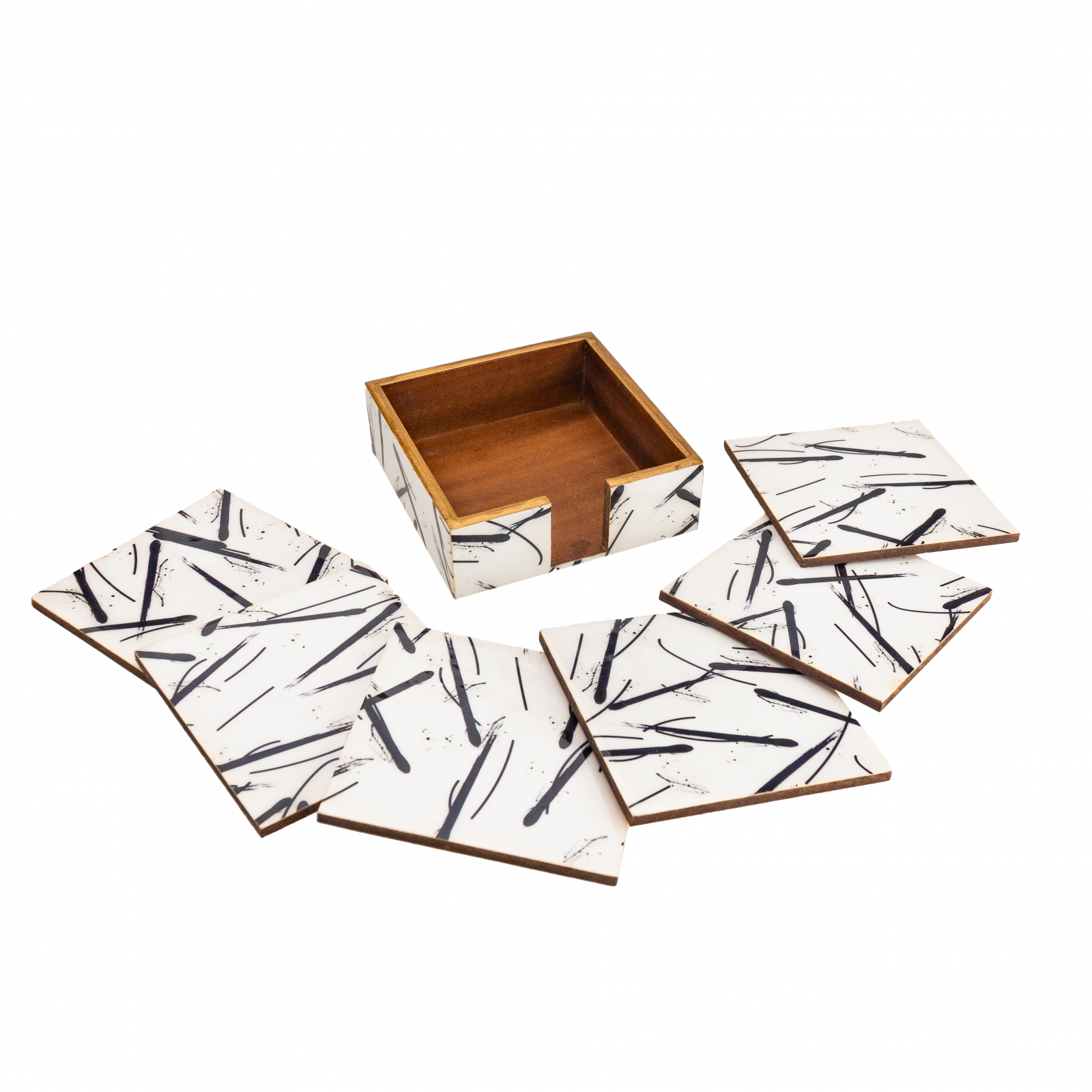 Adauga un strop de eleganta si utilitate colectiei tale cu acest set de 6 suporturi pentru pahare, imbogatit cu un model colorat si un suport deosebit.